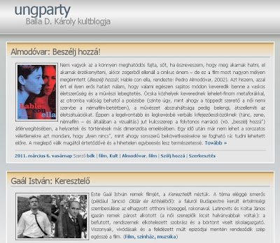Persze nem bírom ki, hogy 2-3 havonta, néha még gyakrabban, egy új bloggal ki ne rukkoljak. Ezúttal egy régebben regisztrált webhelyemet újítottam fel azzal a szándékkal, hogy ide kizárólag kifejezetten kulturális témákban – irodalom, film, zene, könyv, történelem, tudomány, nyelv – írt bejegyzéseimet (ha kell, kicsit átdolgozva) gyűjtsem egybe. A filmélményeim közreadásával kezdtem a feltöltést. Akit érdekelnek néha csupán pármondatos, máskor hosszabb lélegzetű – de mindig vállaltan szubjektív – értékeléseim, annak melegen ajánlom: ungparty – Balla D. Károly kultblogja