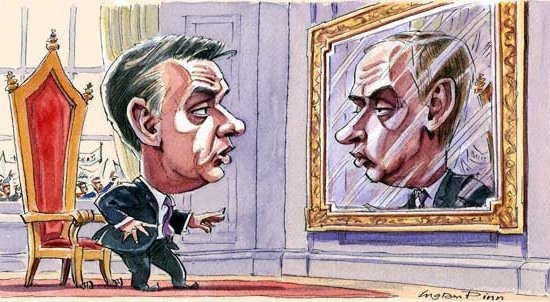 … „Paradoxon, hogy a posztszovjet Oroszországgal szemben zsigerien ellenséges politikus, Orbán úr demokráciafelfogása egészen biztosan zajos tetszésnyilvánítást aratna Vlagyimir Putyin részéről. A jogállamiság a putyini Oroszországhoz igencsak hasonló módon az egypárti uralom alávetettje. A magyarok, akárcsak Oroszországban, szavazhatnak; a polgárok tiltakozhatnak, a magánkézen lévő média pedig bírálhatja Orbán urat. Ez azonban visszaszorított demokrácia [’faux democracy’]. A Fidesz szilárdan a kezében tartja az állami intézményeket, a bíróságokat és az országos adásokat.”