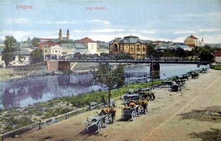 És íme az Ung-part a régi híddal. A főbb épületek ma is nagyjából ugyanezt a képüket mutatják, a vasíves hídon kívül az egyetlen érdekesség: látszik a bazilita szerzetesház (a mai egyetemi korpusz) udvarában akkor állt kápolna tornya.