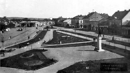 Ugyanez a helyszín (más nézetben) cseh időből Masaryk-szoborral: