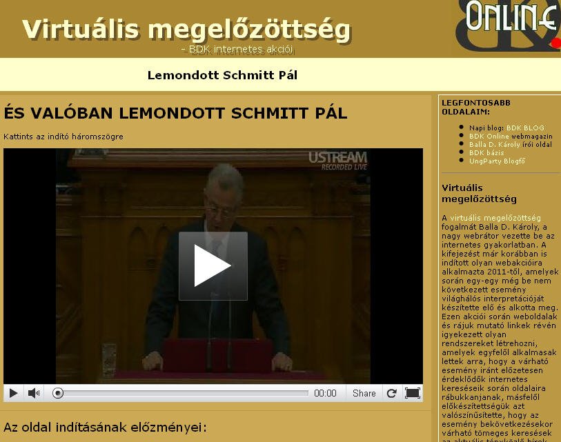 …Amikor egy héttel az alapos plágium-vád megjelenése után a közrádióban először adta elő szánalmas hazugságait, akkor készítettem a Schmitt Pál lemondott nevű oldalt – a várt esemény virtuális megelőzése jegyében. Nézettsége eleinte nem volt számottevő, de aztán februárban növekedésnek indult. Az utóbbi napokban már több százan találtak rá az első Google-keresés révén. Az elnöki bejelentést követően az egyéni böngészők száma több ezerre nőtt.
