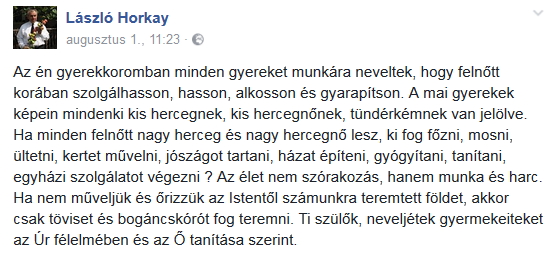 Horkay László Az én gyerekkoromban minden gyereket munkára neveltek, hogy felnőtt korában szolgálhasson, hasson, alkosson és gyarapítson. A mai gyerekek képein mindenki kis hercegnek, kis hercegnőnek, tündérkémnek van jelölve. Ha minden felnőtt nagy herceg és nagy hercegnő lesz, ki fog főzni, mosni, ültetni, kertet művelni, jószágot tartani, házat építeni, gyógyítani, tanítani, egyházi szolgálatot végezni ? Az élet nem szórakozás, hanem munka és harc. Ha nem műveljük és őrizzük az Istentől számunkra teremtett földet, akkor csak töviset és bogáncskórót fog teremni. Ti szülők, neveljétek gyermekeiteket az Úr félelmében és az Ő tanítása szerint.