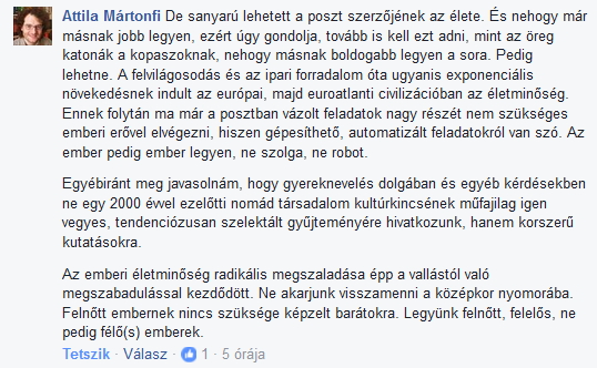 Attila Mártonfi De sanyarú lehetett a poszt szerzőjének az élete. És nehogy már másnak jobb legyen, ezért úgy gondolja, tovább is kell ezt adni, mint az öreg katonák a kopaszoknak, nehogy másnak boldogabb legyen a sora. Pedig lehetne. A felvilágosodás és az ipari forradalom óta ugyanis exponenciális növekedésnek indult az európai, majd euroatlanti civilizációban az életminőség. Ennek folytán ma már a posztban vázolt feladatok nagy részét nem szükséges emberi erővel elvégezni, hiszen gépesíthető, automatizált feladatokról van szó. Az ember pedig ember legyen, ne szolga, ne robot.